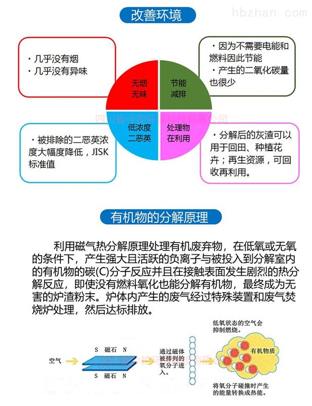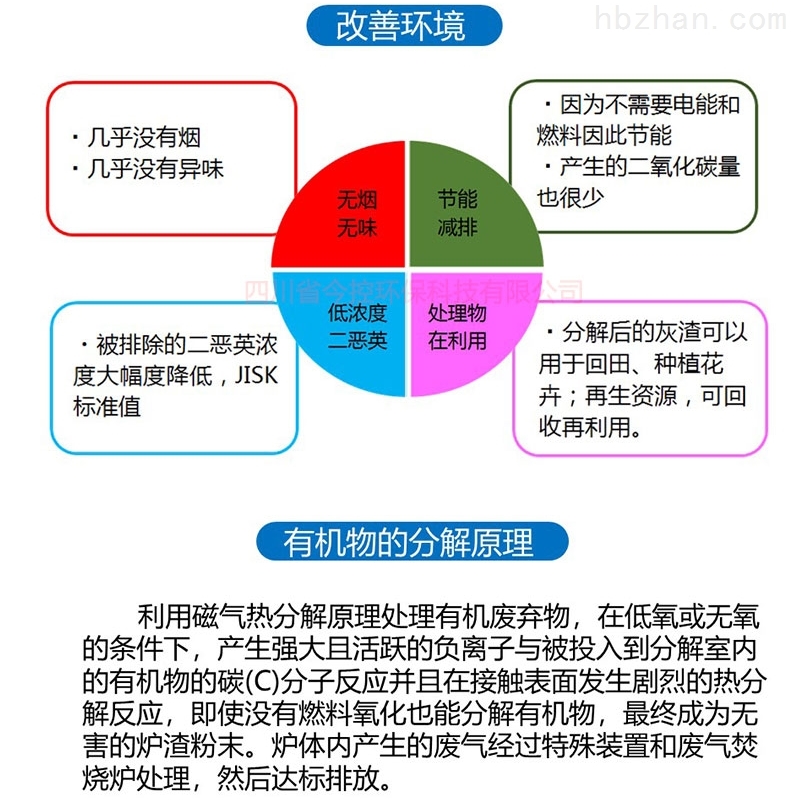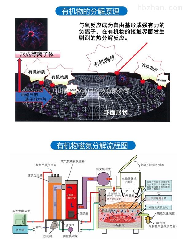 4、负离子与被投入到分解机内的有机物的碳(C)分子反应,并且在接触面发生剧烈的热分解反应,即使没有燃料也可以氧化分解有机物。